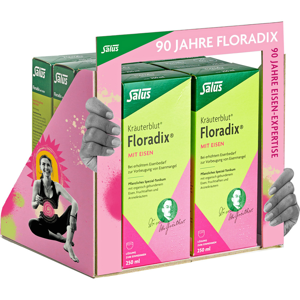 Seit 1935 hilft die Marke Floradix Menschen mit erhöhtem Eisenbedarf – und ist heute aus Apotheken nicht mehr wegzudenken. Das pflanzliche Tonikum Floradix mit Eisen steht für eine wirksame und gut verträgliche Eisenversorgung, naturheilkundliches Wissen und eine Erfolgsgeschichte, die in diesemJahr sein 90. Jubiläum feiert. Und ist dabei aktueller denn je – denn nach wie vor leidet mehr als jede zehnte Frau unter Eisenmangel. Heute enthält Floradix mit Eisen in der empfohlenen Tagesdosis 36,8 Milligramm zweiwertiges Eisen – ergänzt durch sorgfältig ausgewählte natürliche Kräuterauszüge und mit Vitamin C für die optimale Eisenaufnahme. Der Ansatz der Niedrig-Eisen-Therapie und die damit einhergehende gute Verträglichkeit, die flüssige Form und die pflanzliche Basis machen das Tonikum besonders beliebt. Zum 90-jährigen Jubiläum feiert Salus auch am Point of Sale: Mit speziellen Regalrahmen wird Floradix prominent im Regal platziert. Begleitet wird die Aktion von Anzeigen und Displays mit Geburtstagsdesign, die auf Floradix aufmerksam machen und für zusätzliche Sichtbarkeit sorgen. /