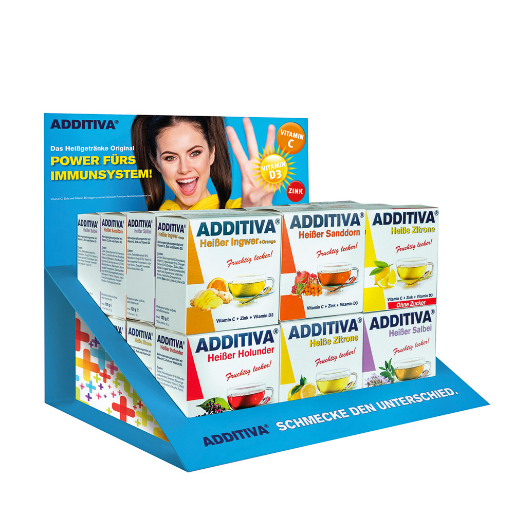 In der kalten Jahreszeit steigt die Nachfrage nach den köstlichen Additiva®-Heißgetränken. Daher sollte den Apothekenkunden die Vielzahl dieser Produkte gut sichtbar und vor allem geschmackvoll präsentiert werden. Genau dafür gibt es ab sofort wieder die auffälligen Displays für die Apotheke: zum einen das HV-Display mit den Maßen 34 cm x 30 cm x 30 cm, in dem 24 verschiedene Packungen Platz haben. Alternativ bietet Dr. Scheffler ein Bodendisplay mit den Maßen 58 cm x 33 cm x 122 cm für 125 Packungen an.