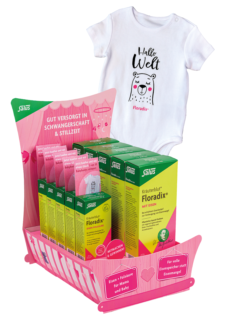 Für die Beratung zu Eisen und Folsäure bei Kinderwunsch, in Schwangerschaft und Stillzeit unterstützt Salus Apotheken mit einer aufmerksamkeitsstarken und emotionalen POS-Aktion. Sie kombiniert das Arzneimittel Floradix mit Eisen und die Floradix Eisen Folsäure Tabletten. Das exklusiv für die Apotheke entwickelte dekorative HV-Display in Babywiegenoptik sorgt für maximale Sichtbarkeit am Point of Sale. Apotheken können bei der Aktion aus drei verschiedenen Paketgrößen wählen und von attraktiven Rabatten profitieren. Beim Kauf der Floradix Eisen Folsäure Tabletten gibt es zusätzlich einen von 50 Babybodys zu gewinnen – ein Anreiz für die Kundinnen, der für noch mehr Aufmerksamkeit in der Offizin sorgt. Mehr Informationen zur Aktion gibt es beim Salus-Außendienst, per Mail an verkauf@salus.pharma.de oder unter 08062 728016. Display und Ware werden in einem Karton angeliefert. Das Display muss nur aufgeklappt, mit den Packungen bestückt und die Gewinnspielkärtchen eingesteckt werden. Die Aktion ist bis zum 31. März 2026 gültig. /