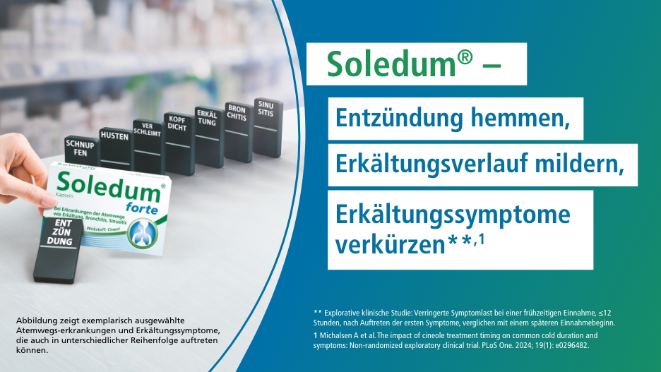 Atemwegserkrankungen werden meist durch Viren ausgelöst. Infolge der Infektion entzündet sich die Schleimhaut, zähflüssiges Sekret entsteht und es folgen klassische Erkältungssymptome. Wichtig ist daher ein Therapieansatz, der sowohl die Entzündung hemmt als auch die Symptome lindert. Hier setzt Soledum® an und verkürzt – frühzeitig eingenommen – Erkältungssymptome.**,1