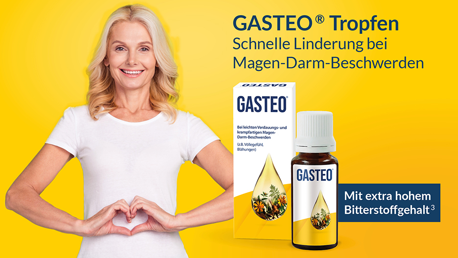 Blähungen, Völlegefühl und Magenkrämpfe – die Nachfrage nach Verdauungsmitteln ist seit Jahren steigend. Besonders viel Wert legen Kunden auf pflanzliche Präparate, die den Magen schnell beruhigen.1 Eine gute Empfehlung sind GASTEO® Tropfen: Mit ihrer besonderen Komposition aus Bitterstoffen und magenberuhigenden Heilpflanzen nutzen sie die synergistische Wirkung von sechs Wirkstoffen. Ihr besonderer Vorteil liegt in der raschen und zuverlässigen Linderung vielfältiger Magen-Darm-Beschwerden. Warum sich die Wirkung bereits im Mund entfaltet? Ein Blick auf den pflanzlichen Verdauungshelfer lohnt sich doppelt: Jetzt Wissen stärken und die Chance auf einen tollen Gewinn sichern – mit dem GASTEO®-Wissens-Check.