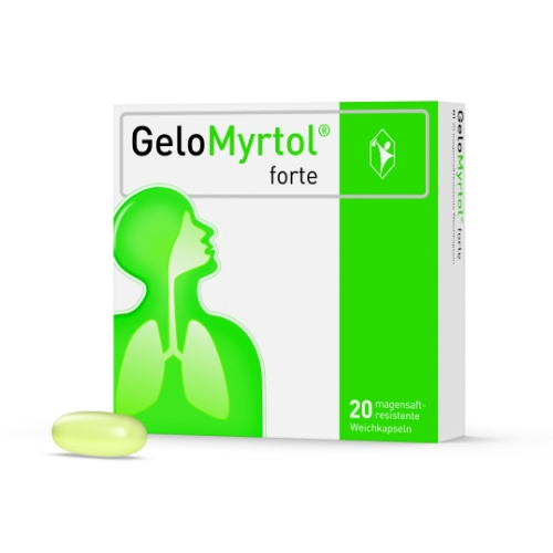 GeloMyrtol® forte. Zus.-Setz.: 1 magensaftresist. Weichkps. enth. 300 mg Destillat aus einer Mischung v. rektifiziertem Eukalyptusöl, rektifiziertem Süßorangenöl, rektifiziertem Myrtenöl u. rektifiziertem Zitronenöl (66:32:1:1). Sonst. Bestandt.: Raffiniertes Rapsöl, Gelatine, Glycerol 85 %, Sorbitol-Lösung 70 % (nicht kristallisierend), Hypromelloseacetatsuccinat, Triethylcitrat, Natriumdodecylsulfat, Talkum, Dextrin, Glycyrrhizinsäure, Ammoniumsalz. Anw.: Zur Schleimlösung u. Erleichterung des Abhustens b. ak. u. chron. Bronchitis. Zur Schleimlösung b. Entzündungen der Nasennebenhöhlen (Sinusitis). Zur Anw. b. Erwachsenen, Jugendlichen u. Kindern ab 6 Jahren. Gegenanz.: Nicht anwenden b. entzündl. Erkr. i. Bereich Magen-Darm u. d. Gallenwege, schweren Lebererkr., bek. Überempfindlichkeit gg. einen d. Bestandt. des Arzneim., b. Säuglingen u. Kindern unter 6 Jahren. Atemwegserkrankungen, die mit einer ausgeprägten Überempfindlichkeit der Atemwege einhergehen, Schwangerschaft/Stillzeit: Anwendung nach sorgfältiger Nutzen-Risiko-Abwägung durch den Arzt. Nebenwirk.: Magen- o. Oberbauchschmerzen, allergische Reakt. (wie Atemnot, Gesichtsschwellung, Nesselsucht, Hautausschlag, Juckreiz), Entzündung der Magenschleimhaut o. der Darmschleimhaut, Übelkeit, Erbrechen, Durchfall o. andere Verdauungsstörungen, Geschmacksveränderungen, Kopfschmerzen o. Schwindel, In-Bewegung-Setzen v. vorh. Nieren- u. Gallensteinen, schwere anaphylaktische Reakt. Enth. Sorbitol. Pohl-Boskamp, Hohenlockstedt (11)