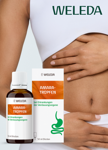 Für die Wirkstoffkombination der Amara-Tropfen von Weleda belegen präklinische Studien die verdauungsfördernde und krampflösende Wirkung bei funktionellen Magen-Darm-Beschwerden: Die enthaltenen Bitterstoffe beeinflussen motilitätshemmende Rezeptoren und entspannen so den Magenfundus.1, 2 Zudem steigern sie die Freisetzung von Magensäure durch die Aktivierung von Bittergeschmacksrezeptoren.3 Durch die gesteigerte Absonderung von Verdauungssekreten wie Speichel und Magensäure üben Amara-Tropfen einen anregenden Effekt auf den Darm aus. Sie können dadurch Übelkeit, Völlegefühl und Sodbrennen lindern. Krämpfe und Blähungen werden reduziert. Eine erhöhte Bildung und Abgabe von Gallensäure erleichtert zudem die Verdauung von fettem Essen.