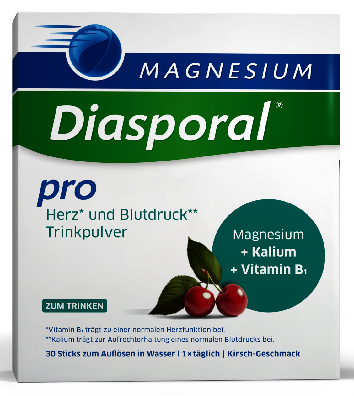 Das bewährte Diasporal-Pro-Portfolio hat Zuwachs bekommen. Seit Januar ist es auch als ausgewogene Nährstoff-Kombination aus Magnesium, Kalium und Vitamin B1 erhältlich – Magnesium-Diasporal® Pro Herz* und Blutdruck**. Damit steht ein Nahrungsergänzungsmittel für alle, die ihre Herzgesundheit unterstützen möchten, zur Verfügung. Die Rezeptur des neuen Magnesium-Diasporal® Pro Herz* und Blutdruck** basiert auf aktuellen ernährungswissenschaftlichen Erkenntnissen und enthält wichtige Mikronährstoffe mit guter Bioverfügbarkeit. Besonders praktisch ist die Darreichung als Trinkpulver mit Kirschgeschmack in vordosierten Sticks zur 1 x täglichen Einnahme. Enthalten sind Vitamin B1 (1,1 mg), das die normale Herzfunktion unterstützt, Kalium (500 mg aus Kaliumcitrat), das zur Aufrechterhaltung eines normalen Blutdrucks beiträgt sowie hochdosiertes Magnesium (300 mg aus Magnesiumcitrat), das zu einer normalen Muskelfunktion und zum Elektrolytgleichgewicht beiträgt. Das neue Magnesium-Diasporal® Pro Herz* und Blutdruck** ist vegan, zucker-, gluten- und laktosefrei und daher bei Diabetes geeignet.