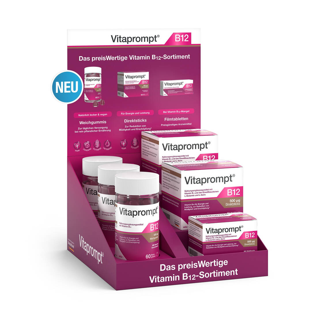 Ab sofort steht Apotheken ein neues HV-Multifunktions-Display für das Vitamin-B12-Produktportfolio von Vitaprompt® zur Verfügung. Das flexible Präsentationssystem kann klassisch als HV-Display mit Topschild oder als Regaltreppe ohne Schild eingesetzt werden – je nach Platzangebot und Sichtwahlkonzept. Die verschiedenen Darreichungsformen von Vitaprompt werden den unterschiedlichen Bedürfnissen der Patienten gerecht. Die Vitaprompt 1000 µg Tabletten (Arzneimittel) unterstützen dabei, Symptome eines Vitamin-B12-Mangels zu lindern. Das Produktportfolio wird seit Kurzem durch die neuen Vitaprompt B12 500 µg Weichgummis (Nahrungsergänzungsmittel) mit Beerengeschmack sowie die neuen Vitaprompt Direktsticks (Nahrungsergänzungsmittel) mit 500 μg Vitamin B12 in Kombination mit den Eiweißbausteinen L-Glutamin und L-Serin ergänzt. Das neue HV-Multifunktions-Display kann ab sofort über den Apothekenaußendienst oder direkt beim Kundenservice per E-Mail an auftragsannahme@dermapharm.com angefordert werden. /