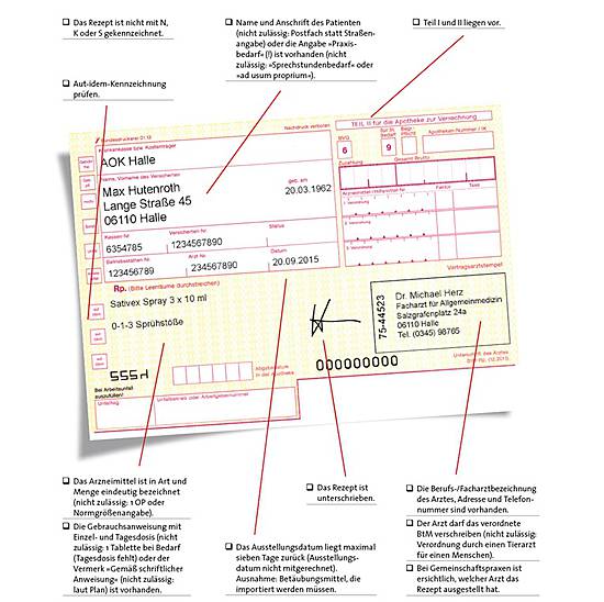 So weit, so einfach. Diffizil wird die Sache aber häufig, wenn ein Rezept nicht vollständig und/oder nicht korrekt ausgestellt ist. Apotheken dürfen dabei nur wenige Korrekturen eigenständig vornehmen. Ohne Rücksprache mit dem Arzt dürfen sie nur Änderungen oder Ergänzungen bei den Patientenangaben durchführen. Patienten müssen diese dann glaubhaft versichern oder durch andere Unterlagen belegen können. Nicht verändern dürfen sie das Ausstellungsdatum des Rezeptes. Alle anderen Änderungen bedürfen der Rücksprache mit dem Arzt, und sie müssen stets auf allen drei Teilen des Rezeptes vorgenommen und abgezeichnet werden.