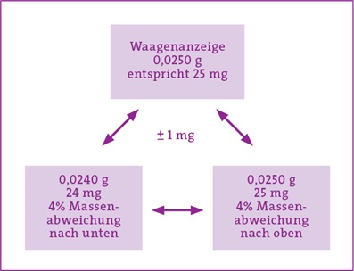 »Kann man mit der Feinwaage 25 mg Betamethasonvalerat mit ausreichender Genauigkeit abwiegen?«, fragt Kirchhoff dann in die Runde. »Das ist unproblematisch, denn die Mindestlast von 10 mg ist doch überschritten«, meint eine PTA. »Ja, stimmt. Aber es gibt ein Problem, das mit der sogenannten Verkehrsfehlergrenze zu tun hat, also der eichtechnisch erlaubten Abweichung nach oben und unten«, antwortet die Chefin. Als sie die fragenden Gesichter ihrer Mitarbeiter sieht, erklärt sie: »Schauen Sie auf das Typenschild unserer Analysenwaage: Der Eichwert e ist angegeben mit 0,001 g. Dieser Wert wird auch Verkehrsfehlergrenze genannt, da er die vom Eichamt erlaubte Abweichung definiert. Das bedeutet, jede geeichte und damit verkehrsfähige Waage hat einen Wägefehler, der jedoch begrenzt sein muss. Unsere Analysenwaage hat also bis zur Gesamtbelastung von 50 g einen maximalen Wägefehler, der einmal dem Eichwert e entspricht. Als Wert ausgedrückt ist eine Abweichung von bis zu ±1 mg möglich. Wenn Sie also punktgenau 0,0250 g Betamethasonvalerat einwiegen, dann beträgt die auf dem Wägeteller liegende Menge zwischen 24 und 26 mg.« Dies bedeutet, dass die abgewogene Menge bis zu 4 Prozent vom geforderten Gewicht abweichen kann. Laut NRF sind Wägungen bei der Arzneimittelherstellung möglichst auf 1,0 Prozent genau vorzunehmen.
