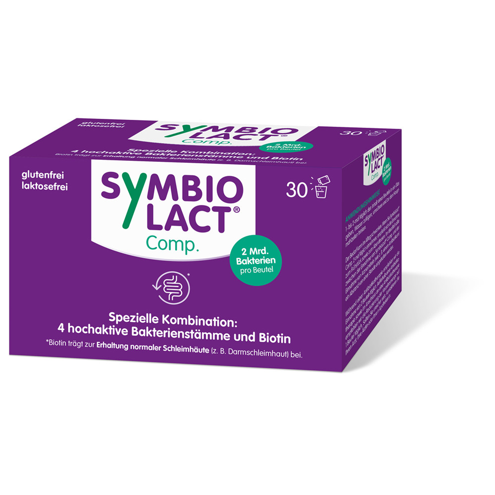 Hier setzt SymbioLact® Comp. an: Das Nahrungsergänzungsmittel bietet mit einer wissenschaftlich fundierten Kombination aus vier charakterisierten Milchsäurebakterienstämmen und Biotin eine praxisnahe Option zur ernährungsphysiologischen Unterstützung eines entgleisten Darmmikrobioms und des gesamten Darms. Im Mittelpunkt steht das Duo aus Lactobacillus acidophilus (LA-5®) und Bifidobacterium animalis subsp. lactis (BB-12®). Während das aerotolerante Lactobacillus acidophilus LA-5® vor allem den sauerstoffreicheren Dünndarm adressiert, bevorzugt das strikt anaerobe Bifidobacterium animalis subsp. lactis BB-12® den anoxischen Dickdarm. BB-12® zeichnet sich durch ein hohes Adhärenzvermögen an Darmepithelzellen und eine robuste Toleranz gegenüber Magen- und Gallensäure aus. LA-5® wiederum kann Wasserstoffperoxid (H₂O₂) bilden, was ein Milieu schafft, das für potenziell pathogene Keime ungünstig ist.