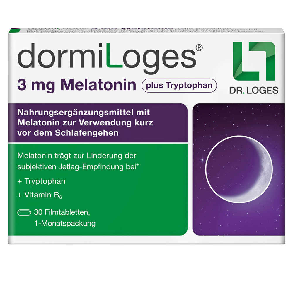 Der Körper synthetisiert Melatonin normalerweise über mehrere Zwischenstufen aus der Aminosäure Tryptophan. Studien lieferten auch hier Hinweise, dass eine Tryptophan-Supplementation die Einschlafzeit verkürzen kann. Dr. Loges bietet mit dormiLoges® 1 mg Melatonin plus Tryptophan und dormiLoges® 3 mg Melatonin plus Tryptophan zwei Präparate mit Melatonin an. Beide werden einmal täglich kurz vor dem Schlafengehen mit reichlich Wasser eingenommen.