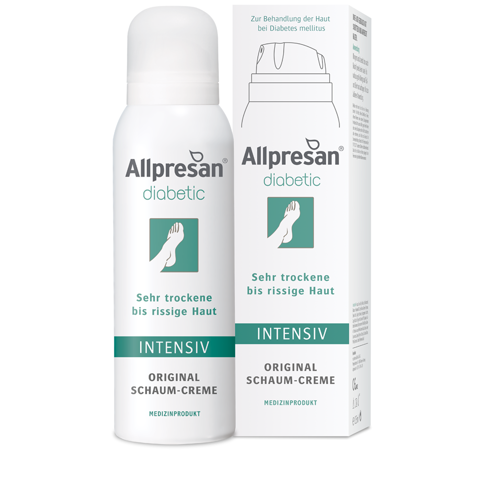Diabetes mellitus betrifft allein in Deutschland über 8,5 Millionen Erwachsene. Damit steigt auch die Häufigkeit schwerwiegender Fußkomplikationen. Die Diabetes-Fußpflegeprodukte von Allpresan wurden speziell entwickelt, um den besonderen Bedürfnissen der Haut bei Diabetes gerecht zu werden. Zur Stärkung der Hautbarriere empfiehlt die Allpresan diabetic Intensiv Schaum-Creme. Dank der BarrioExpert-Technologie bildet die Schaum-Creme auf der Haut ein atmungsaktives Schutznetz, das dazu beiträgt, den transepidermalen Wasserverlust, trockene Haustellen und Risse und damit potenzielle Infektionswege zu reduzieren, ohne die natürlichen Hautfunktionen einzuschränken. Der einzigartige Pflege-Schaum verbindet dabei die Vorteile einer lipidreichen Emulsion mit der leichten Verteilbarkeit eines Schaums. Ein weiterer Vorteil: Die Schaum-Creme ist bis zu doppelt so ergiebig wie vergleichbare Cremes. Idealerweise sollte die Allpresan diabetic Intensiv Schaum-Creme zweimal täglich (morgens und abends) beziehungsweise nach Bedarf auf die betroffenen Hautpartien aufgetragen werden. /