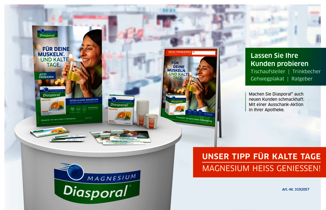 Mit der neuen Heißausschank-Aktion bringt Protina nicht nur wohltuendes Magnesium in die Tasse, sondern auch neue Impulse für das pharmazeutische Beratungsgespräch. Die Verkostung direkt in der Apotheke ermöglicht es Kundinnen und Kunden, den Geschmack des Magnesium-Diasporal® 400 Extra Trinkgranulat selbst zu erleben – ein echter Mehrwert für eine individuelle Produktempfehlung. Das Trinkgranulat überzeugt durch seinen fruchtig-frischen Orangengeschmack und enthält 400 mg körperfreundliches Magnesiumcitrat pro Stick. Die Heißausschank-Aktion wird durch eine komplette Ausstattung unterstützt: Ausschankbox, Tischaufsteller, Trinkbechern, Gehweg-Plakatständer und Ratgeber-Material – bestellbar unter Art.-Nr. 3192058. Die flexible Aufstellung in der Offizin lenkt die Aufmerksamkeit der Kundschaft auf das Thema Magnesiumversorgung und schafft wertvolle Gesprächsanlässe für das pharmazeutische Personal. Jetzt bevorraten mit der Magnesium-Diasporal-Extra-Klasse. Bestellungen direkt bei Protina Pharm. GmbH, 85737 Ismaning, Tel.: 089 996553 137, Fax: 089 996553 888, E-Mail: servicezentrale@protina.de. Informationen unter www.diasporal.com /