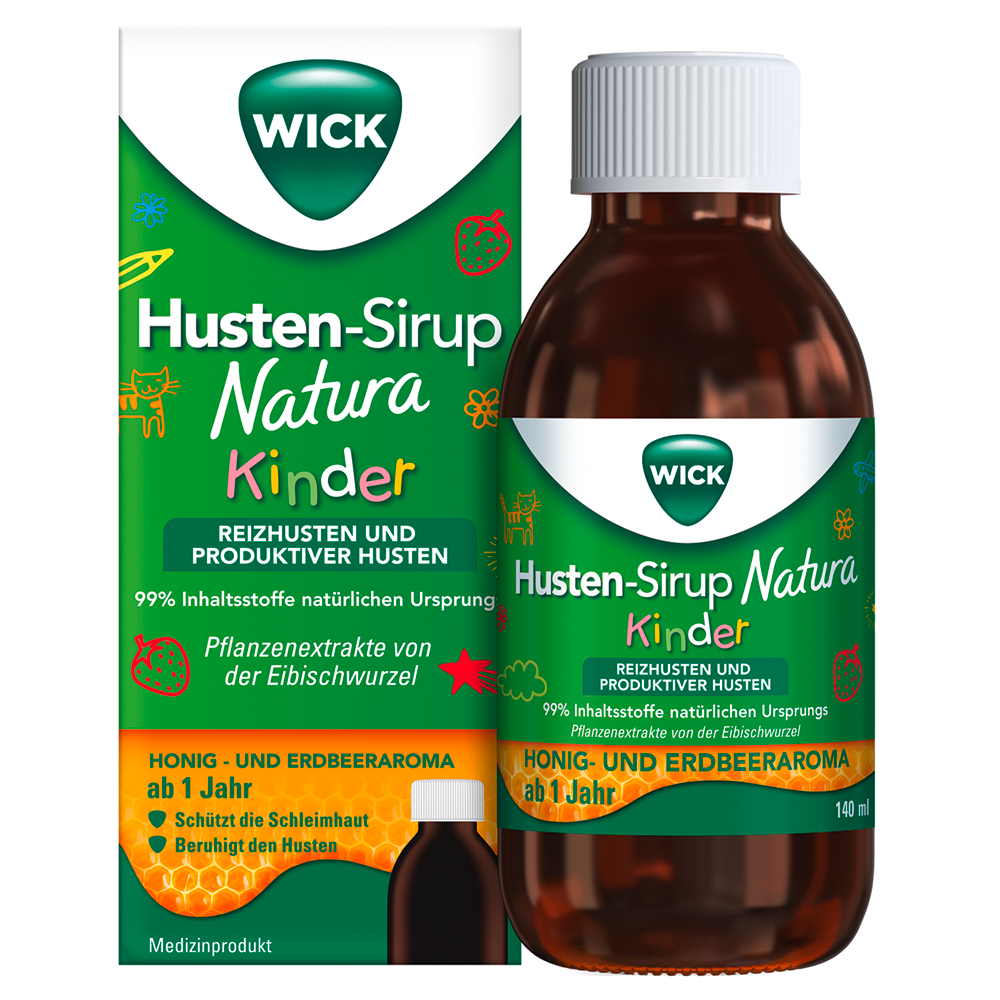 Die WICK Husten-Sirupe Natura (Medizinprodukt) bieten Verbrauchern eine natürliche und wirksame 2-in-1-Lösung zur Linderung von Reizhusten und produktivem Husten. Durch die Wirkung von Xanthan und Gummi arabicum legt sich der Sirup wie ein Schutzfilm über den gereizten Rachen und lindert so den Hustenreiz – natürlich, sicher und lecker. Beim WICK Husten-Sirup Natura sind 100 % der Inhaltsstoffe natürlichen Ursprungs, bei WICK Husten-Sirup Natura für Kinder 99 % der Inhaltsstoffe. Beide Sirupe sind frei von Konservierungsstoffen und Alkohol, Gluten sowie Lactose. Ein angenehmer Geschmack – Honig beim Sirup für Erwachsene und Kinder ab 12 Jahren und Honig & Erdbeere beim Sirup für Kinder – machen die Einnahmen angenehm. 88 % der Eltern bestätigten in einer Umfrage, dass der Geschmack von Honig & Erdbeere ihrem Kind helfen würde, Husten-Sirup einzunehmen. /