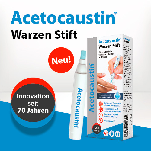 Die Acetocaustin® Lösung 2 ml kennt so gut wie jeder in der Apotheke; sie hilft ja auch schon seit 1956 und gilt weiterhin als effizienteste Variante der Warzenentfernung, denn sie muss nur einmal pro Woche aufgetragen werden. Nun gibt es den traditionsreichen Wirkstoff Monochloressigsäure (MCA) auch in der Anwendung als Stift, natürlich nur in der Apotheke: Der neue Acetocaustin Warzen Stift ist der einzige Warzen-Stift auf dem Markt mit MCA. Er enthält 50 % mehr Wirkstoff als die Acetocaustin Lösung. Diese ist zudem blau eingefärbt, um die Sicherheit bei der Anwendung zu erhöhen. Der Acetocaustin Warzen Stift bietet darüber hinaus die meisten Anwendungen (220), die schnellsten Ergebnisse (eine bis vier Anwendungen meist ausreichend) und das zum günstigsten Preis bei bester Apothekenmarge (Direkteinkauf über roha APD zu Sonderkonditionen). /