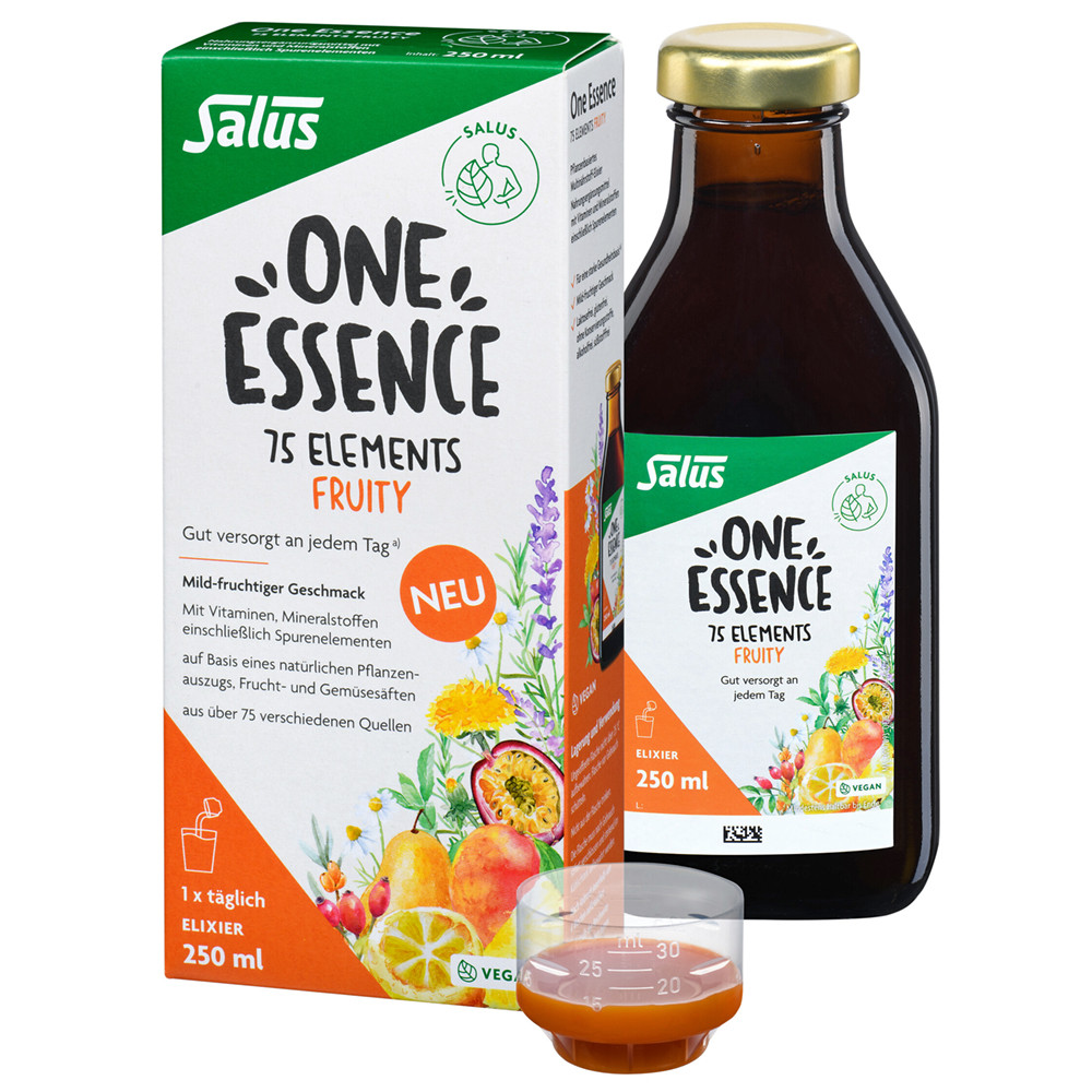 Mit einem Schluck täglich rundum versorgt – und jetzt auch fruchtig im Geschmack: Nach dem erfolgreichen Start von One Essence 75 Elements erweitert Salus sein Sortiment um eine neue Variante. One Essence 75 Elements »Fruity« verbindet die bewährte Nährstoffvielfalt mit einem angenehm fruchtigen Geschmackserlebnis. Wie die Natur setzt One Essence 75 Elements auf Vielfalt. Beide Sorten kombinieren in nur einem Schluck über 75 gesunde Zutaten, wie Vitamine, Mineralstoffe, Kräuter, Gemüse- und Obstsorten sowie ballaststoffreiche Akazienfaser. Damit liefert eine Flasche vergleichbar viele Vitalstoffe wie 14 kg ausgewähltes Obst und Gemüse. Neu ist die fruchtige Rezeptur: One Essence 75 Elements »Fruity« überzeugt durch eine harmonische, mild-fruchtige Geschmacksnote und seine kräftig orange Farbe. Die Polyphenole, die bei der ersten Sorte für die herbe Note sorgen, werden in der neuen Rezeptur ersetzt durch mehr antioxidative Mikronährstoffe. Übrigens: Mit der Einführung der neuen »Fruity«-Variante erhält die bewährte Sorte den Namenszusatz »Intense« und eine neue Optik. /