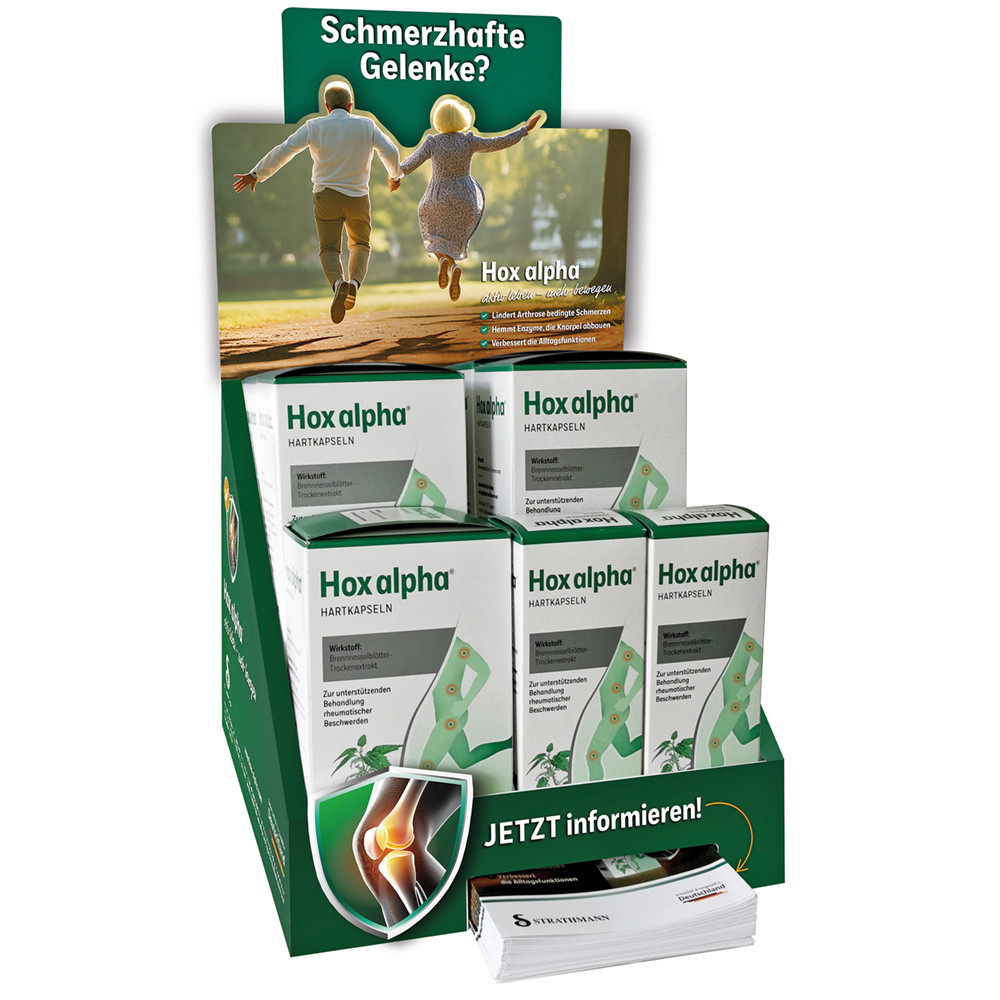 Arthrose zählt zu den häufigsten chronischen Gelenkerkrankungen in Deutschland – rund 12 Millionen Menschen sind betroffen. Viele von ihnen suchen in der Apotheke nach kompetenter Beratung und wirksamen Produkten, die ihre Beschwerden lindern können. Passend dazu bietet Strathmann einen aufmerksamkeitsstarken HV-Aufsteller für den pflanzlichen Zytokinhemmer Hox alpha® mit hochkonzentriertem Brennnesselblätter-Extrakt. Der kompakte Aufsteller ist speziell für die Platzierung im Bereich der Sichtwahl am HV-Tisch konzipiert und hilft, Kunden mit Gelenkschmerzen gezielt anzusprechen. Mit dieser Maßnahme stärkt Strathmann die Sichtbarkeit der Indikation Arthrose am Point of Sale und unterstützt Apotheken in ihrer Rolle als kompetente Anlaufstelle für Kunden mit Gelenkbeschwerden. Interessierte Apotheken können den HV-Aufsteller – inklusive informativen Patientenflyern – sowie die passende Schaufensterdekoration unkompliziert über das Serviceteam unter service@dermapharm.com oder direkt über den Apothekenaußendienst bestellen. /