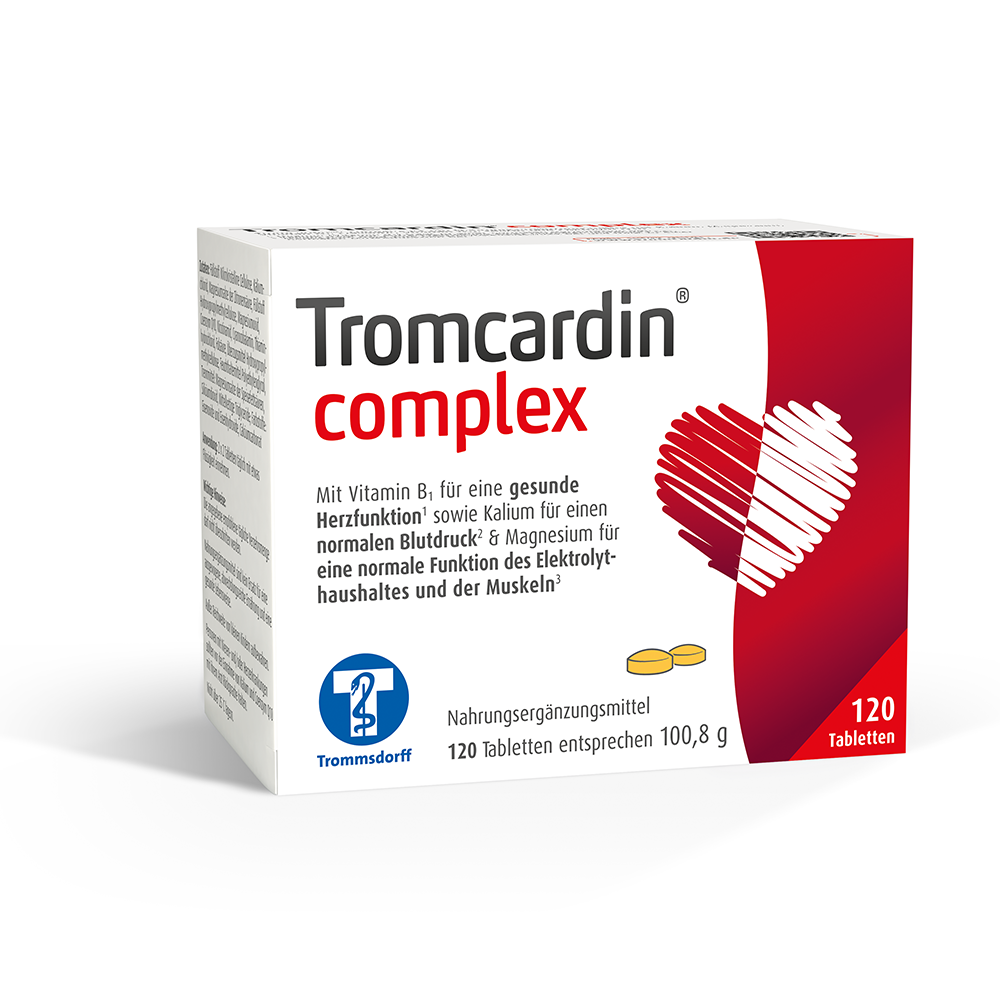 Eine ausreichende Versorgung mit herzwichtigen Mikronährstoffen wie Kalium und Magnesium ist grundsätzlich über eine ausgewogene Ernährung möglich. In der Praxis zeigt sich jedoch, dass dies nicht immer gelingt. Zum einen können verschiedene Wirkstoffgruppen wie Diuretika, Protonenpumpen-Inhibitoren und Corticoide den Elektrolythaushalt im Körper beeinflussen. Zum anderen können Stress, aktuelle Ernährungstrends und bestimmte Lebensstilfaktoren das Gleichgewicht der Elektrolyte stören. Dann kann eine gezielte Supplementierung mit Tromcardin® complex sinnvoll sein. Dieses versorgt das Herz mit Elektrolyten und weiteren herzwichtigen Mikronährstoffen. Die Kombination enthält Kalium, das zur Aufrechterhaltung eines normalen Blutdrucks, einer normalen Funktion des Nervensystems und einer normalen Muskelfunktion beiträgt. Zudem enthält sie Magnesium zur Unterstützung des Elektrolytgleichgewichts, der normalen Muskelfunktion und des Energiestoffwechsels sowie Vitamin B1 für eine normale Herzfunktion. Auch enthalten sind Folsäure, Niacin und Coenzym Q10. /