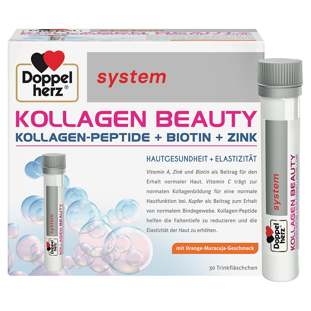 Doppelherz® system Kollagen Beauty gibt es jetzt auch in der Geschmacksrichtung Orange-Maracuja. Das Nahrungsergänzungsmittel enthält eine Kombination aus ausgesuchten Nährstoffen. Jedes Trinkfläschchen enthält 2,5 g Kollagen-Peptide, 0,96 mg Beta-Carotin, 5 mg Zink, 150 µg Biotin, 80 mg Vitamin C, 150 µg Kupfer, 3 mg α-TE Vitamin E und 100 mg Açai-Beeren-Extrakt. Kollagen-Peptide können helfen, die Elastizität der Haut zu erhöhen und die Faltentiefe und feine Gesichtslinien zu reduzieren. Vitamin C leistet einen Beitrag zur normalen Kollagenbildung für eine normale Funktion der Haut. Vitamin A, Biotin und das Spurenelement Zink tragen zum Erhalt normaler Haut bei. Kupfer leistet einen Beitrag zur normalen Hautpigmentierung und zum Erhalt von normalem Bindegewebe. Vitamin E trägt dazu bei, die Zellen vor oxidativem Stress zu schützen. Verzehrempfehlung: Täglich den Inhalt eines Trinkfläschchens einnehmen. Vor dem Verzehr gut schütteln. /