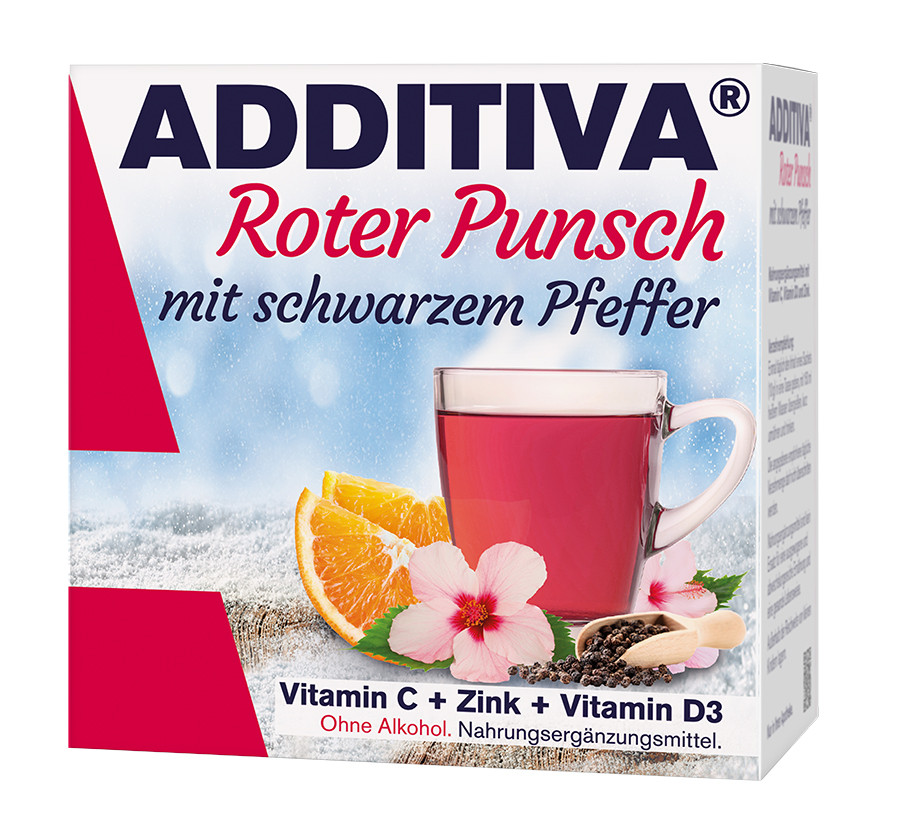 Das Heißgetränk des Jahres 2025 von Additiva Roter Punsch mit schwarzem Pfeffer erweitert das bestehende Heißgetränke-Sortiment um ein Geschmackserlebnis, dass es so bei Additiva noch nicht gibt: Der süße Fruchtgeschmack wird perfekt mit einer leicht scharfen Pfeffernote abgerundet. Und das Schöne: Das neue Heißgetränk tut nicht nur unserer Seele etwas Gutes, sondern dank seiner wertvollen Inhaltsstoffe auch unserem Körper. So sind die enthaltenen Vitamine C und D gerade in der kalten Jahreszeit entscheidend für ein gut funktionierendes Immunsystem. Vitamin C sorgt für die Aktivierung der Abwehrkräfte, während Vitamin D3 sowohl für das Immunsystem als auch für den Erhalt starker Knochen unabdingbar ist. Verstärkung erhält das „Immunpower-Duo“ erstmalig in einem Additiva-Heißgetränk durch Zink. Die Heißgetränke sind kinderleicht zuzubereiten. Sachet aufreißen, den Inhalt in heißes Wasser geben und sich an der wärmenden Köstlichkeit erfreuen. Scharf, fruchtig, erfrischend, mild oder kräftig – all diese Geschmackserfahrungen bieten die Additiva-Heißgetränke, die ausschließlich in Apotheken erhältlich sind. /