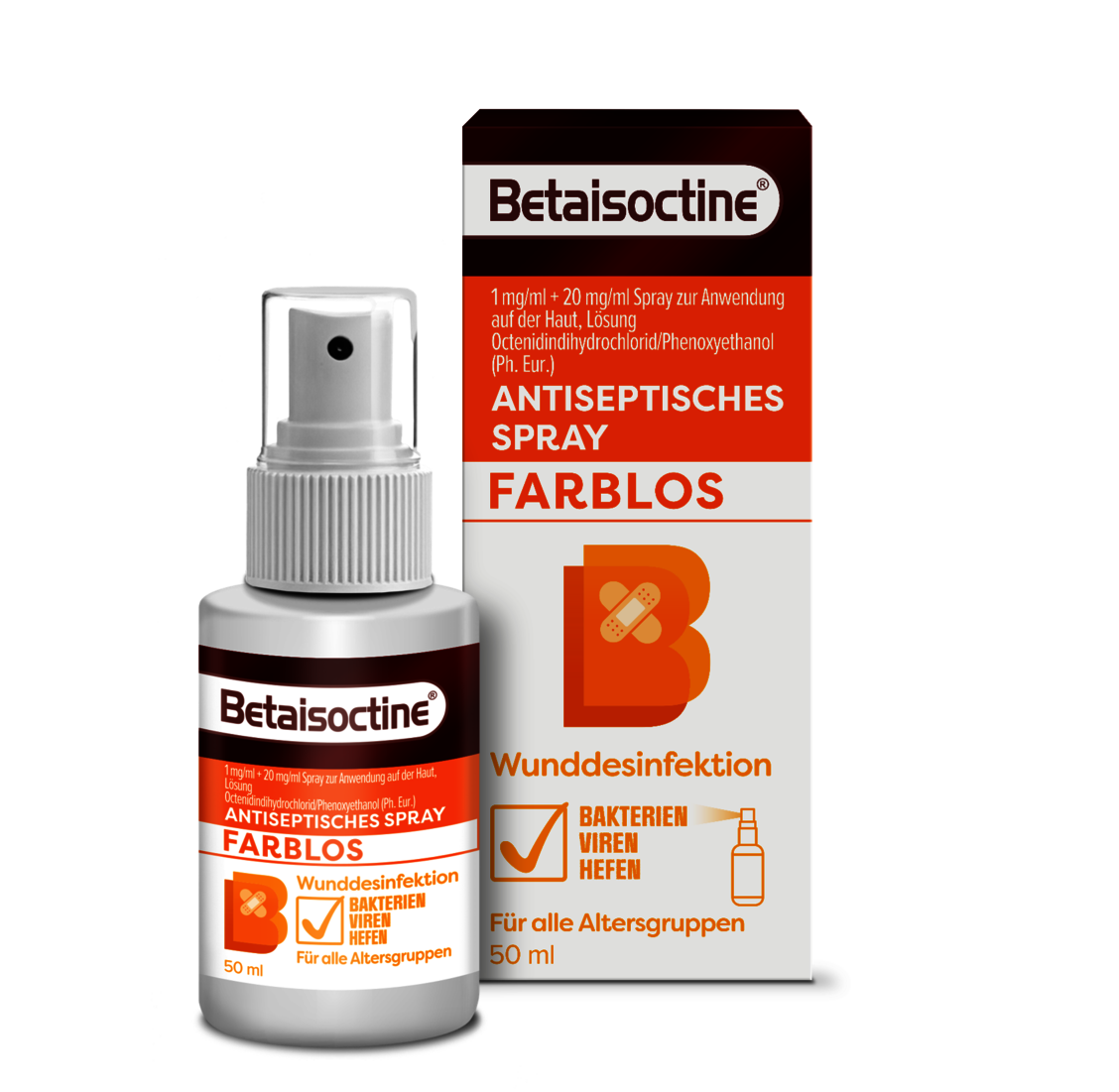 Im Alltag sollte ein Wunddesinfektionsmittel für kleine und oberflächliche Verletzungen griffbereit sein, um eine Infektion zu vermeiden. Eine etablierte Marke in diesem Bereich ist Betaisodona® – bekannt zum Beispiel als Salbe oder Lösung mit typischer brauner Färbung. Der enthaltene Komplex Povidon-Iod (PVP-Iod) setzt elementares Iod frei, das gegen Bakterien, Viren und Pilze wirkt. Aktuell hat das Portfolio farblosen Zuwachs bekommen. Das apothekenpflichtige Betaisoctine® Spray enthält Octenidindihydrochlorid und Phenoxyethanol und ist zur Desinfektion von oberflächlichen Alltagswunden geeignet. Es kann bereits bei Neugeborenen angewendet werden. Nach 60 Sekunden tritt die Wirkung gegen Bakterien, Viren und Hefen ein. Octenidin ist kationisch und wirkt unter anderem, indem es mit negativ geladenen Zellwandbestandteilen der Mikrobenzelle reagiert – dadurch stirbt die Zelle ab. Eine Resistenzbildung ist bislang wie bei PVP-Iod nicht bekannt. /