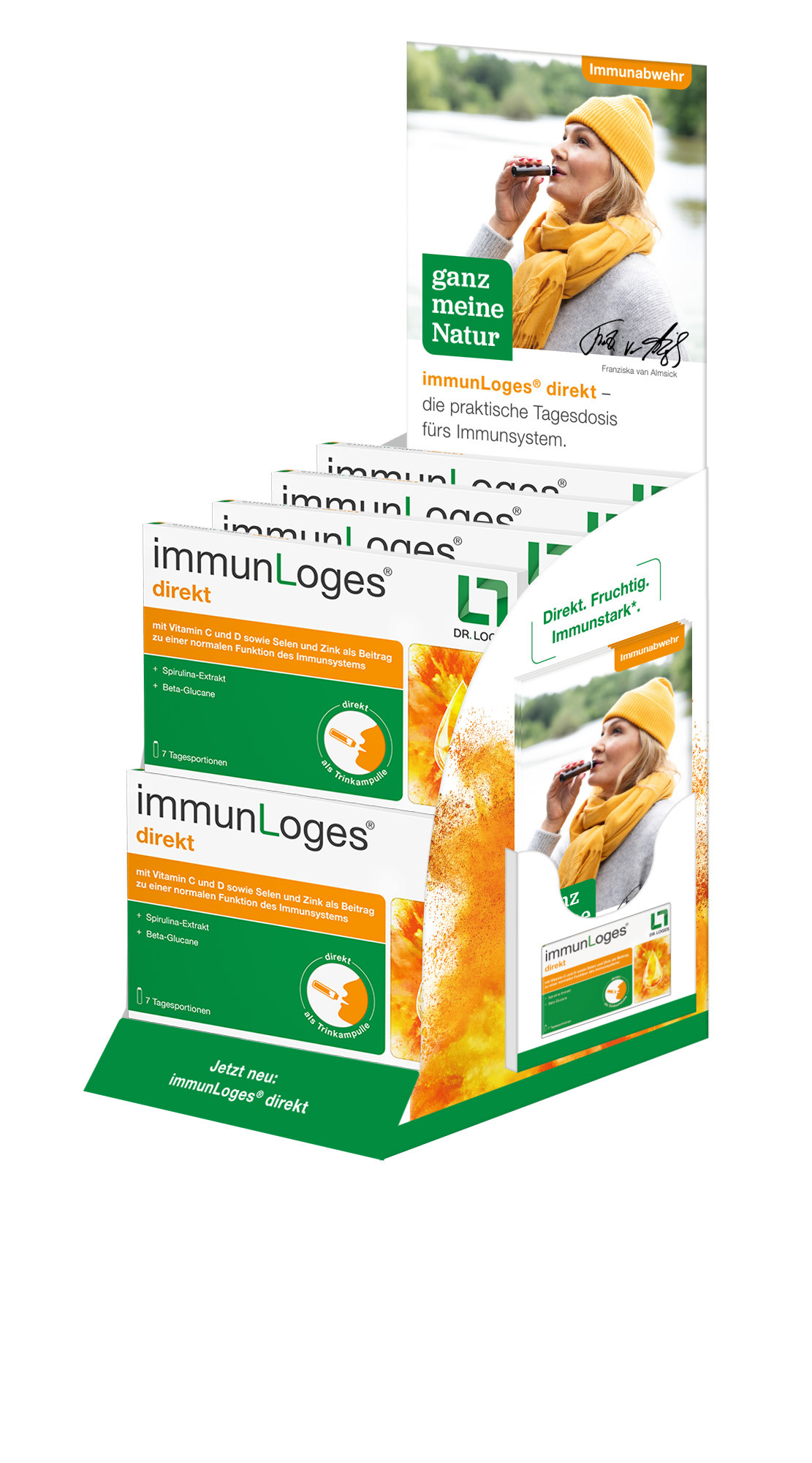 Das neue immunLoges® direkt bietet eine umfassende und natürliche Unterstützung für das Immunsystem. Es kombiniert die Vitamine D und C mit den Mikronährstoffen Zink und Selen sowie mit Beta-Glucanen und Spirulina-Extrakt in einer praktischen Trinkampulle mit fruchtigem Geschmack. Ab sofort erhältlich: das aufmerksamkeitsstarke HV-Display mit der mehrfachen Welt- und Europameisterin Franziska van Almsick. Das Display ist bestückt mit 8 x 7 Trinkampullen. Die kompakte Größe (B 18,2 x H 40,2 x T 15,3 cm) ist passend für jeden HV-Tisch. Ergänzend gibt es ein DIN-A1-Plakat für Schaufenster und Gehwegaufsteller. Konditionen und Informationen beim Dr.-Loges-Außendienst, telefonisch unter 04171 707 297 oder per E-Mail an fakturierung@loges.de /