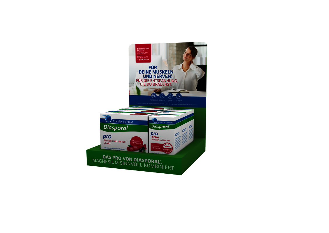 In Zeiten erhöhter Anforderungen im Alltag wächst der Bedarf an gezielter Nährstoffunterstützung. Das neue HV-Display für Magnesium-Diasporal® Pro Muskeln und Nerven bietet die ideale Lösung für eine aufmerksamkeitsstarke Platzierung und kompetente Beratung. Das Angebot enthält zudem 30 Gratis-Proben der innovativen Kombination aus Magnesium und B-Vitaminen – perfekt für das Beratungsgespräch und zum Kennenlernen. Das Display ist schlank, praktisch und auffällig (Maße: H 27 cm, B 21 cm, T 22 cm) für die absatzstarke HV-Platzierung. Das Display-Angebot (Art.-Nr. 3192081) enthält jeweils sechs Packungen beider Darreichungsformen sowie 30 Gratis-Proben des Direktgranulats zur Beratungsunterstützung. Beratung, Informationen und Bestellungen direkt bei: Protina Pharm. GmbH, 85737 Ismaning , Tel.: 089 996553 137, Fax: 089 996553888, E-Mail: servicezentrale@protina.de /