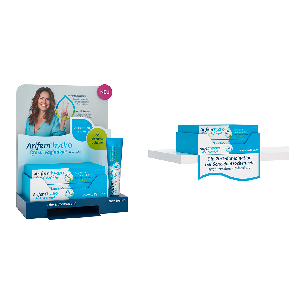 Ab sofort unterstützt Aristo Pharma Apotheken mit neuem, aufmerksamkeitsstarkem POS-Material rund um das hormonfreie Arifem® hydro 2in1 Vaginalgel, welches dank der Kombination aus Hyaluronsäure und Milchsäure für eine Symptomlinderung und pH-Unterstützung bei vaginaler Trockenheit sorgt. Neben einem ausführlichen Informationsflyer zum Thema Scheidentrockenheit steht künftig ein praktischer HV-Aufsteller zur Verfügung, der flexibel an die Bedürfnisse jeder Apotheke angepasst werden kann. Mit dem neuen Flyer zur Abgabe an Betroffene erhalten Apothekenteams ein kompaktes Informationsmaterial, das wichtige Fakten zum Thema Scheidentrockenheit zusammenfasst – von Ursachen und typischen Symptomen bis hin zu Therapieoptionen. Das Besondere an dem neuen HV-Aufsteller: Das integrierte Tray, in dem die Packungen von Arifem hydro konfektioniert sind, ist herausnehmbar. So können Apotheken wahlweise den kompletten Aufsteller im HV-Bereich platzieren oder ausschließlich das Tray in der Sicht- oder Freiwahl einsetzen. Dies ermöglicht eine flexible Handhabung und optimale Sichtbarkeit des Produkts am POS. /