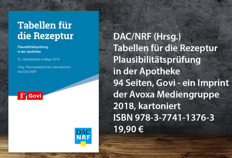 Tabellen für die Rezeptur – Plausibilitätsprüfung in der Apotheke herausgegeben vom Pharmazeutischen Laboratorium des DAC/NRF. Versandkostenfrei bestellen bei govi.de – dem Buchshop für Pharmazeuten.