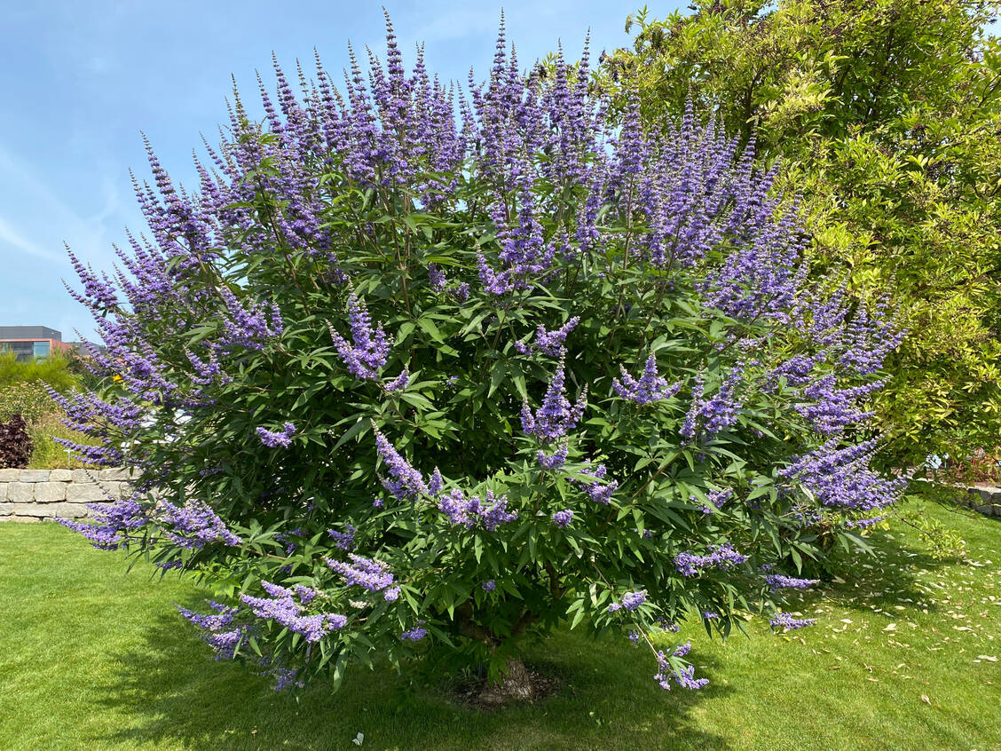 Etwas aus der Reihe, das heißt nicht eindeutig nach Inhaltsstoff-Aspekten einsortierbar, tanzt der Busch des Mönchspfeffers (Vitex agnus-castus). Passenderweise steht die Arzneipflanze des Jahres 2022 zwischen den Beeten »Polyphenole« und »Mono-/Sesquiterpene«, und auch die »Diterpene« und »ätherischen Öle« sind nicht weit. Derzeit könnte man ihn fast als Blickfang des Arzneipflanzengartens bezeichnen, so üppig blüht er und hat ein eigenes Plätzchen inmitten der Rasenfläche bekommen, die er ob seiner Größe gut beschattet. Wie passend, ist doch in den Markt der Mönchspfeffer-enthaltenden Phytopharmaka derzeit Bewegung geraten.