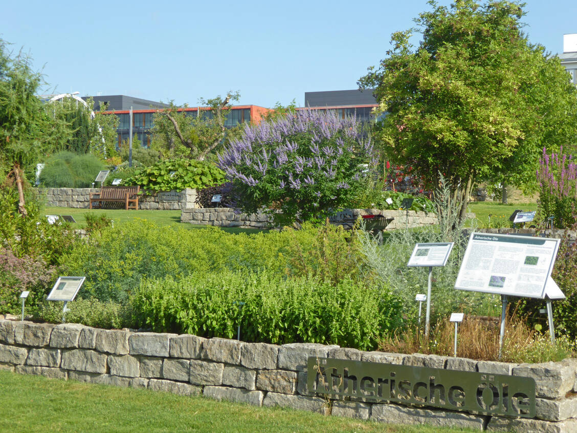 Gerade steht der intensiv rot blühende Rizinus prall im Saft, die Pfefferminze kommt farblich eher dezent daher, treibt aber kräftig in die Quere aus und wildert mit ihren Trieben in fremden Beeten, während die Artischocke mit ihren lila Kronen drei Meter mächtig in die Höhe schießt. Hier in den Beeten herrscht geordnete Unordnung und den Pflanzen wird Raum gelassen. Sie sind – ähnlich Schubladen eines Apothekenschranks – in gemauerten Hochbeeten in die Rasenfläche angelegt, dazwischen immer mal naturbelassene Felder und nicht gemähte Grünstreifen, in der Nachbarschaft ein eigens angelegter Bienengarten. Während die Arzneipflanzen in vergleichbaren Gärten nach Indikationen angeordnet sind, gibt es am Riedberg zehn Beete, die nach phytochemischen Kriterien zusammengestellt sind.