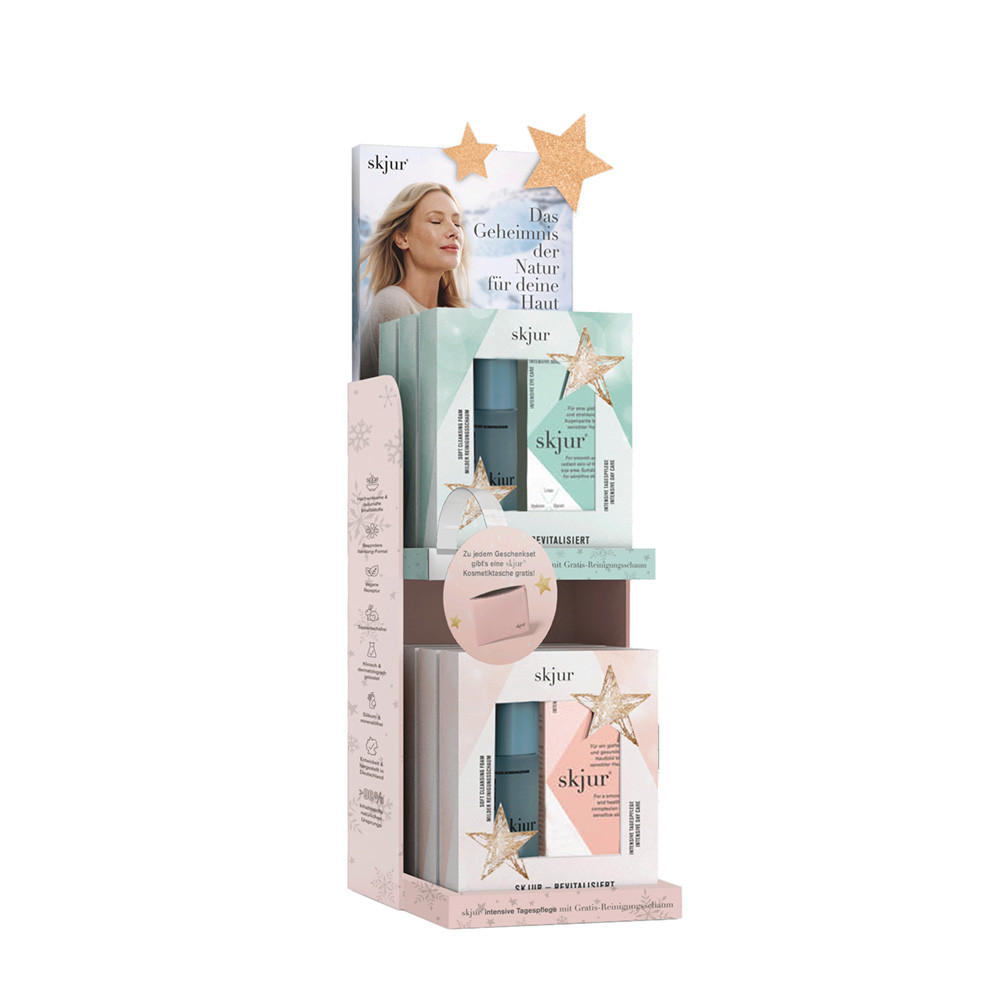 Ursapharm bietet Apotheken für das Weihnachtsgeschäft ab sofort wieder ein festlich gestaltetes Handverkaufsdisplay mit zwei unterschiedlichen Geschenksets der Pflegelinie skjur®. Der HV-Aufsteller wird mit sieben weihnachtlich inspirierten Geschenksets skjur Tagespflege 50 ml und sieben Geschenksets skjur Augenpflege 15 ml geliefert. Neben dem Hauptprodukt enthalten die Sets jeweils einen Gratis-Reinigungsschaum in der Reisegröße 50 ml sowie ein skjur-Kosmetiktäschchen. Das Paket umfasst außerdem Broschüren zur Pflegeserie, Wobbler, Muster und Tragetaschen. Optional kann eine dazu passende Schaufensterdekoration mit Weihnachtselementen bestellt werden. Die Weihnachtsdisplays sind 16 x 36 x 50 cm groß und fassen vier Geschenksets skjur Tagespflege 50 ml und drei Geschenksets skjur Augenpflege 15 ml.